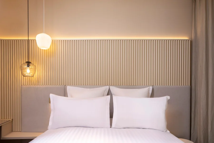Scandée de cannelures laquées pour une mélopée aussi gracieuse qu’enveloppante : la décoration de cette chambre déroule un rythme bien personnel. Tonalités sable et lumière bienveillante donnent la note… et l’allure.