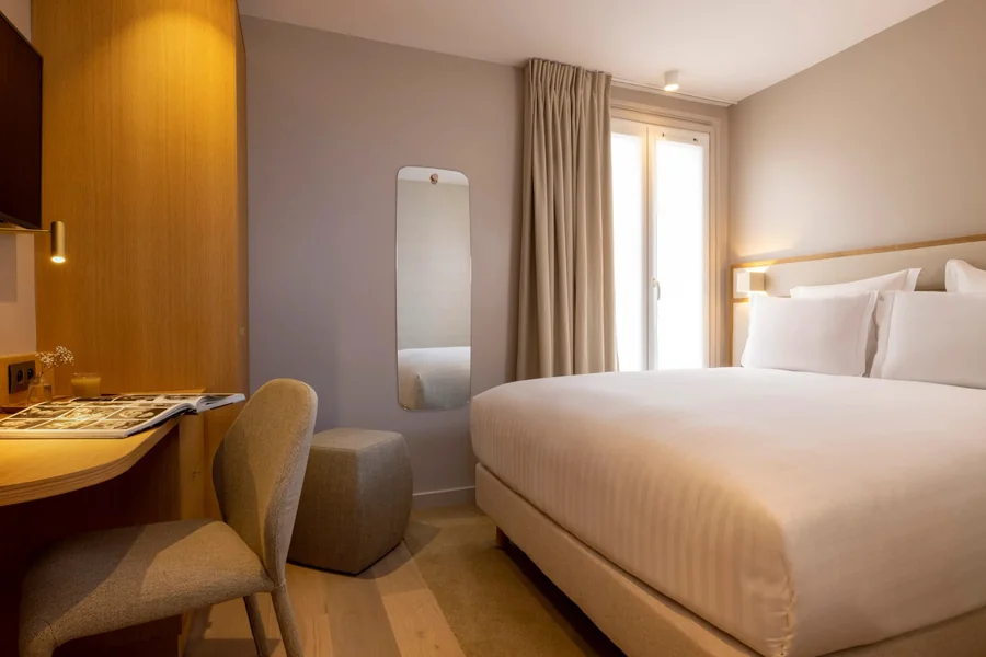 S’ouvrant sur un balcon à la parisienne, le parti-pris tout grège de ces chambres se révèle sous son meilleur jour. En perspective, courbes épurées et sens de la finesse :  jusque dans l’harmonie claire de la salle de bain, l’élégance est là, lumineuse.